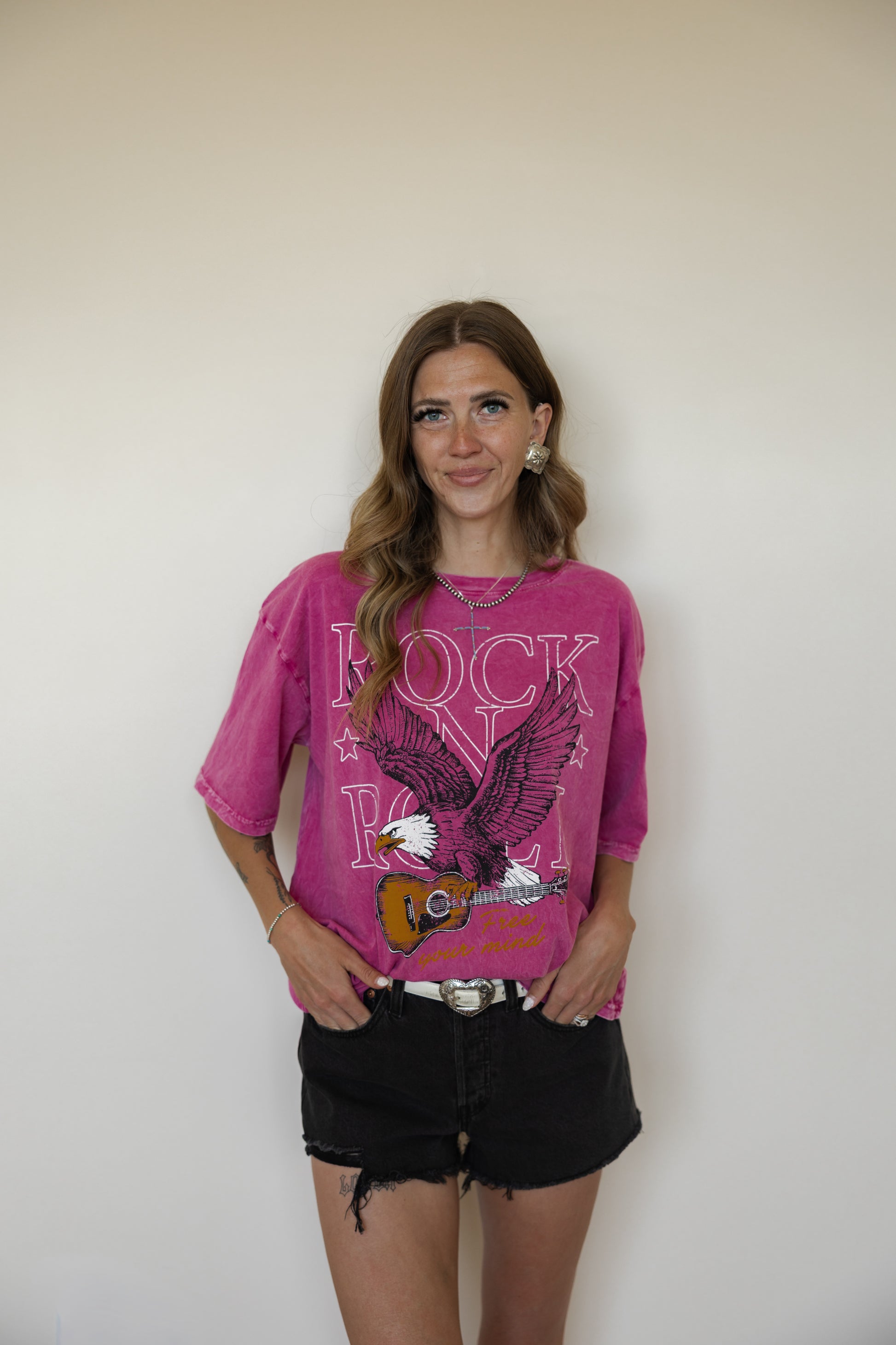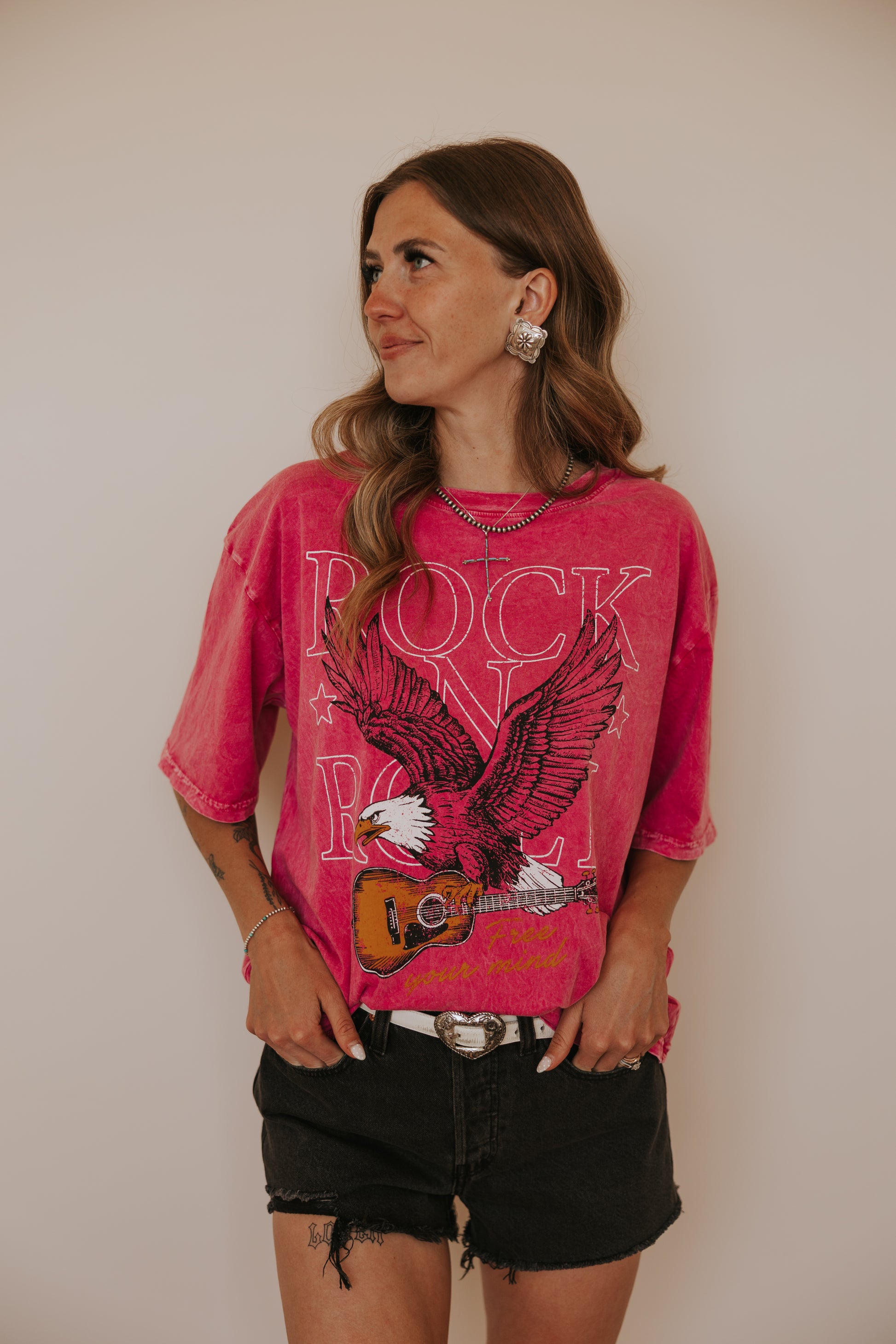 This vintage-inspired graphic tee brings bold attitude and effortless style to your everyday wardrobe. Crafted in a rich, washed magenta hue, it features a striking eagle design clutching a guitar, layered over subtle “Rock N Roll” lettering for a classic, edgy vibe. The soft, worn-in fabric gives it that perfectly lived-in feel from the very first wear.