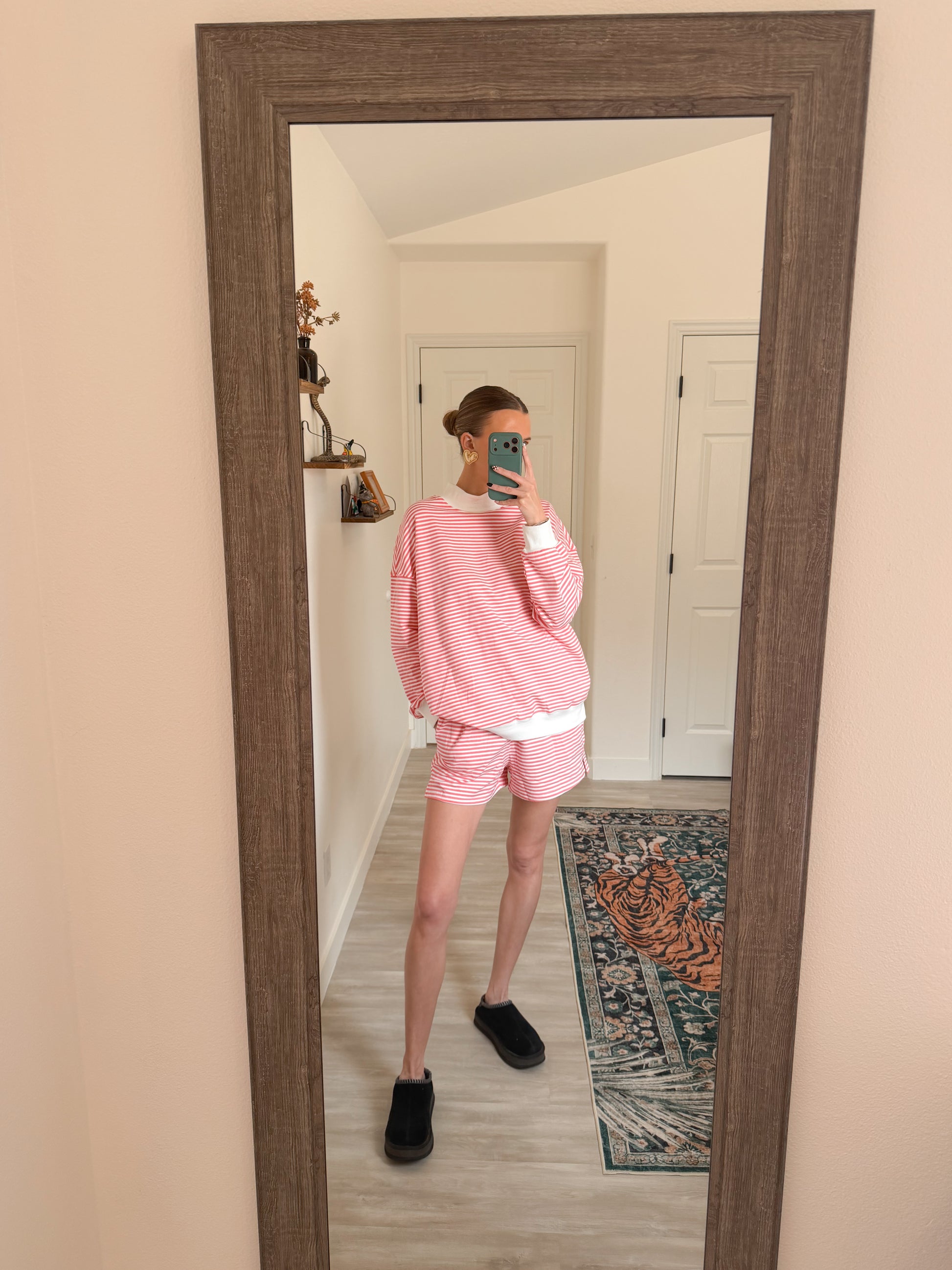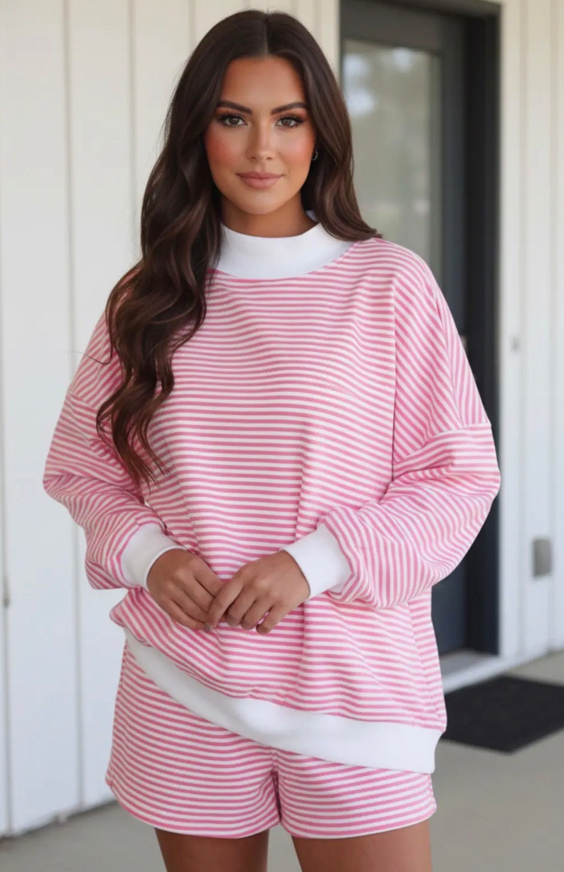 Meet your new off-duty favorite. The Spring Day Lounge Set features a relaxed, oversized long sleeve top with pink and white stripes, finished with a crisp white crew neckline and extended cuffs for that effortlessly cozy feel. The matching high-rise shorts offer an easy elastic waistband and relaxed fit, making this set as comfortable as it is cute.